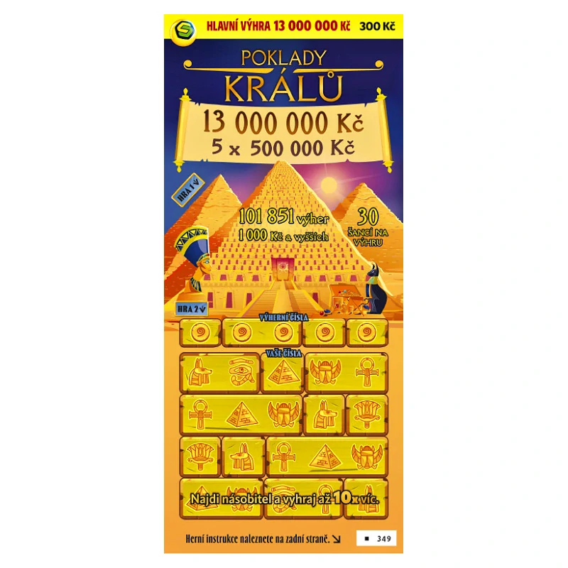 Vydejte se na dobrodružství a objevte tajemné poklady pyramid. Jde o první los, který má barevné symboly pod stírací plochou. Hlavní poklad v hodnotě 13 000 000 Kč a mnoho dalších tak určitě nepřehlédnete.